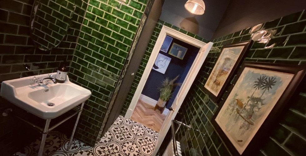 To compliment the green tiles and tie in the black walls, I wanted a monochrome floor. Once again I found endless samples, but finally settled on a geometric floral pattern (after the first tile supplier went into liquidation the day before delivery)