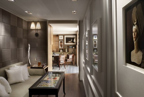 Chi wanted to create a real residence feel, where guests felt like they were entering a luxury home rather than a hotel. In the main lobby the marble black and white floor creates a dramatic entrance, softened by intimate “living” areas surrounded by gilded eglomise glass partitions filled with unique art, books and decorative items.